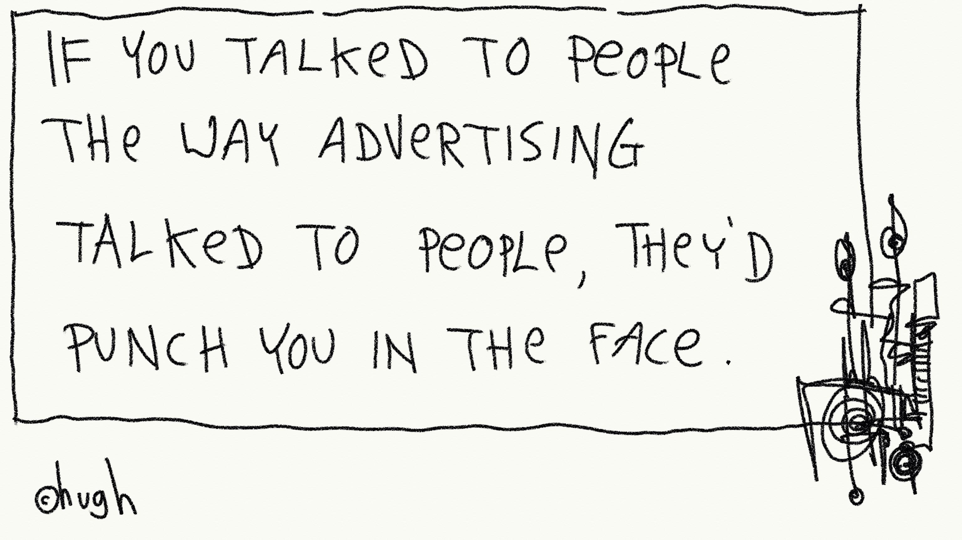 But that expression haunts me, “If you talked to people the way advertising talked to people, they’d punch you in the face”. No one wants to be responsible for work like that, right? So most of the time if I have to "talk to people" I try and keep it as straight as possible. Be straight forward, clear, honest. Say what you need to say and get out of there. (There are exceptions but let's not go into that here.)