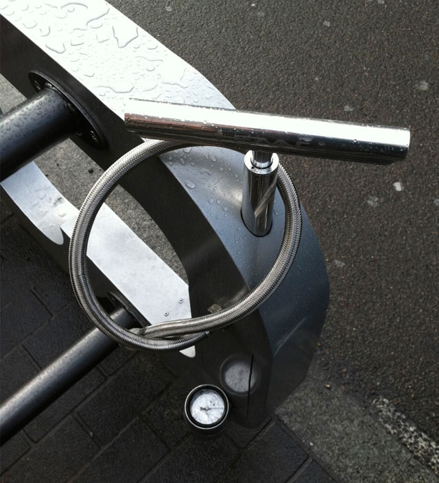 Alistair says, "They’re designed to be installed either temporarily or permanently, and convert one car parking space into ten bike parking spaces. It’s even got a free pump integrated into the frame, so you can keep your tyres nice and firm."