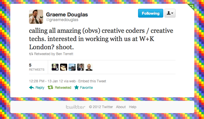 Graeme Douglas at Wieden + Kennedy wants to hear from creative coders. Drop him a line, he's a good man. He doesn't give shitty jobs.
