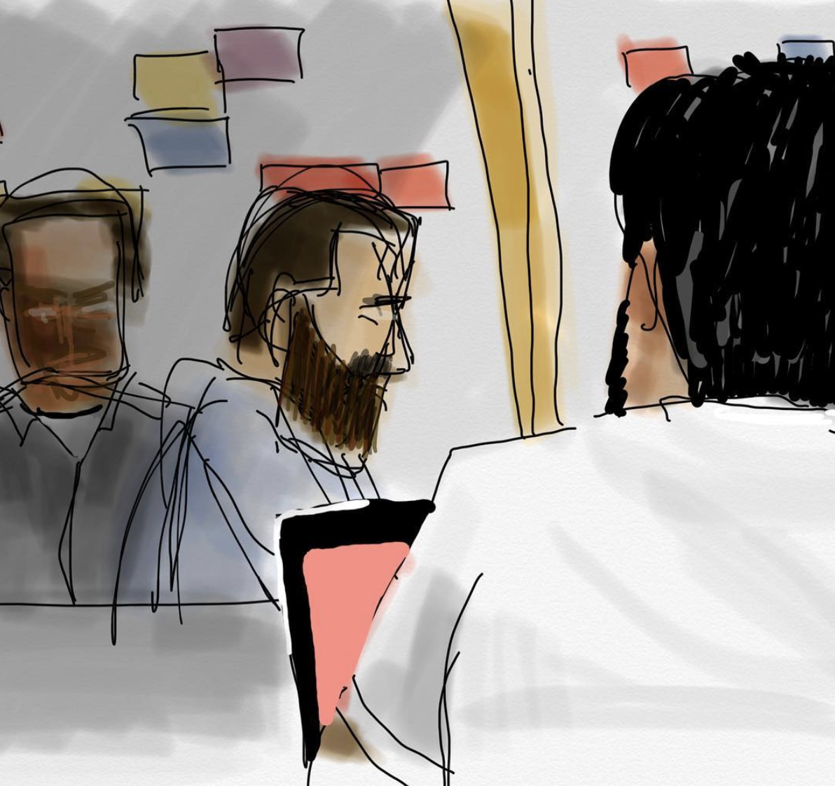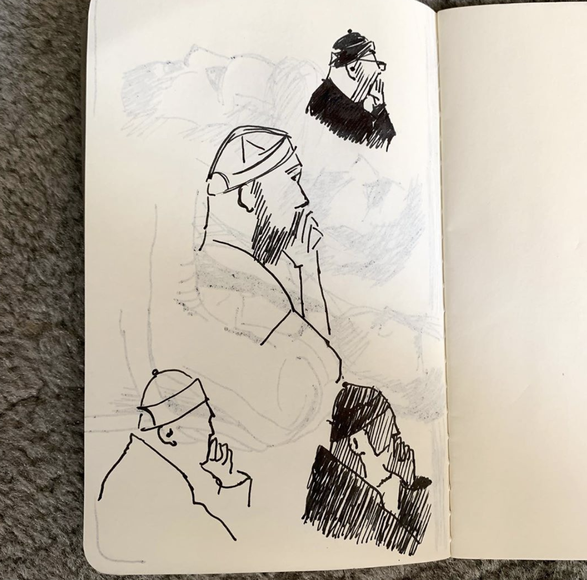 I sit in a lot of meetings, again a good place to observe people sat still for a long time. Sometimes I sketch on an iPad. It's very easy to get a good result but I miss my little notebook. Maybe I should just put one of the stickers on the iPad. That's probably what Russell would do.