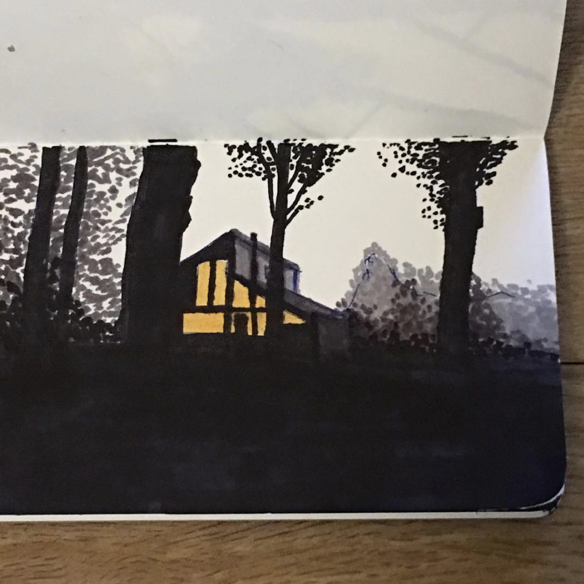 We stayed in a cabin in a forest and walking back one evening I spotted the light and stopped to draw it. I had some pens in the cabin so I went and got them. I love the black and white with one colour effect. I like how it's clearly night even though the sky is white paper.