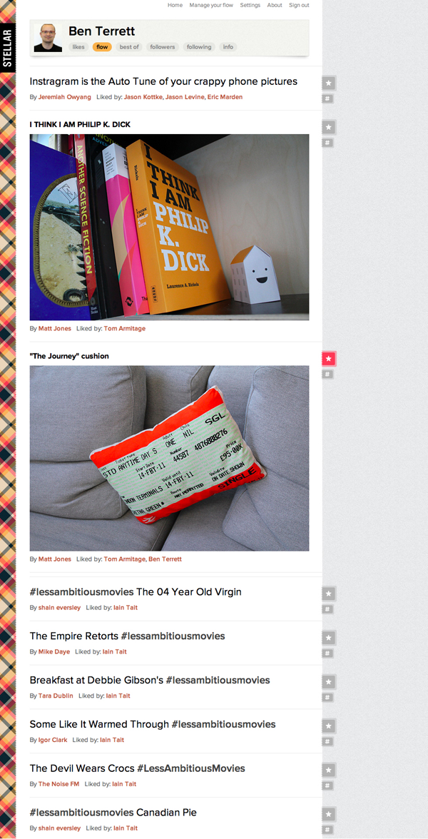 And then there's this which isn't an app, but is a wonderful thing made Jason Kottke called Stellar. You see what you’re friends have favourited on Twitter and Flickr and Vimeo and the like. That’s actually really inspiring, it's invite only at the moment and I'm not sure about plans for a bigger launch. Again it feels like another small thing. This has the added effect of a sort of nearness halo. For example I often see things that friends have favourited by other people I know, but don't necessarily follow. This leads me over there and brings them nearer to me.