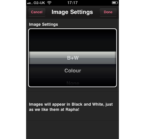 Rapha, who I am a big fan of, launched an app a while back. Visually it's gorgeous, some lovely design details. Really beautiful. I particularly love this bit which allows you to set the app to only display images in black and white. I love that.