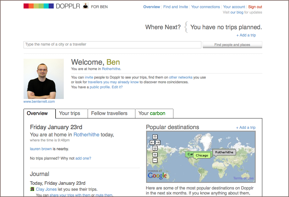 Matt and Matt often talk about creating a website you never have to visit. I love this idea. They're starting to build it. For example, if you book a trip with BA (or any airline) simply forward the email itinerary Dopplr and it will automatically update your page. If you're suddenly taking a last minute one day trip to Manchester, send Dopplr's Twitter account a DM Tweet and it will add the trip for you. You don't even have to go to Dopplr to see your trips, you load them directly into iCal. Smart stuff.