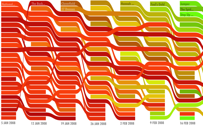 I believe the best method of displaying box office takings is a little similar to this: http://www.nytimes.com/interactive/2008/02/23/movies/20080223_REVENUE_GRAPHIC.html The Ebb and Flow of Movies, by the New York Times. A fantastic piece of work.