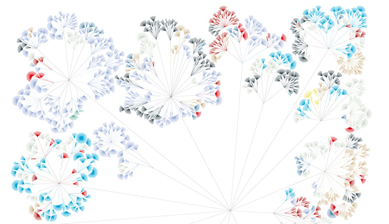 This image is taken from Part One of On the Road by Jack Kerouac. What Stefanie has done here is divide the text into chapters, chapters into paragraphs, paragraphs into sentences, and sentences into words. Everything is colour-coded according to key themes in the literature. It's a style of representing text that aims to visually compare the writing styles of different authors. A beautiful style of information presentation that I haven't seen before.