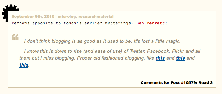 some of us are still plodding along blogging exactly like we did in 2004, waiting for it to come back in to fashion (even if just for a short while). it's like the creak of an old leather jacket with corduroy patches on the elbow and a distant waft of wee.