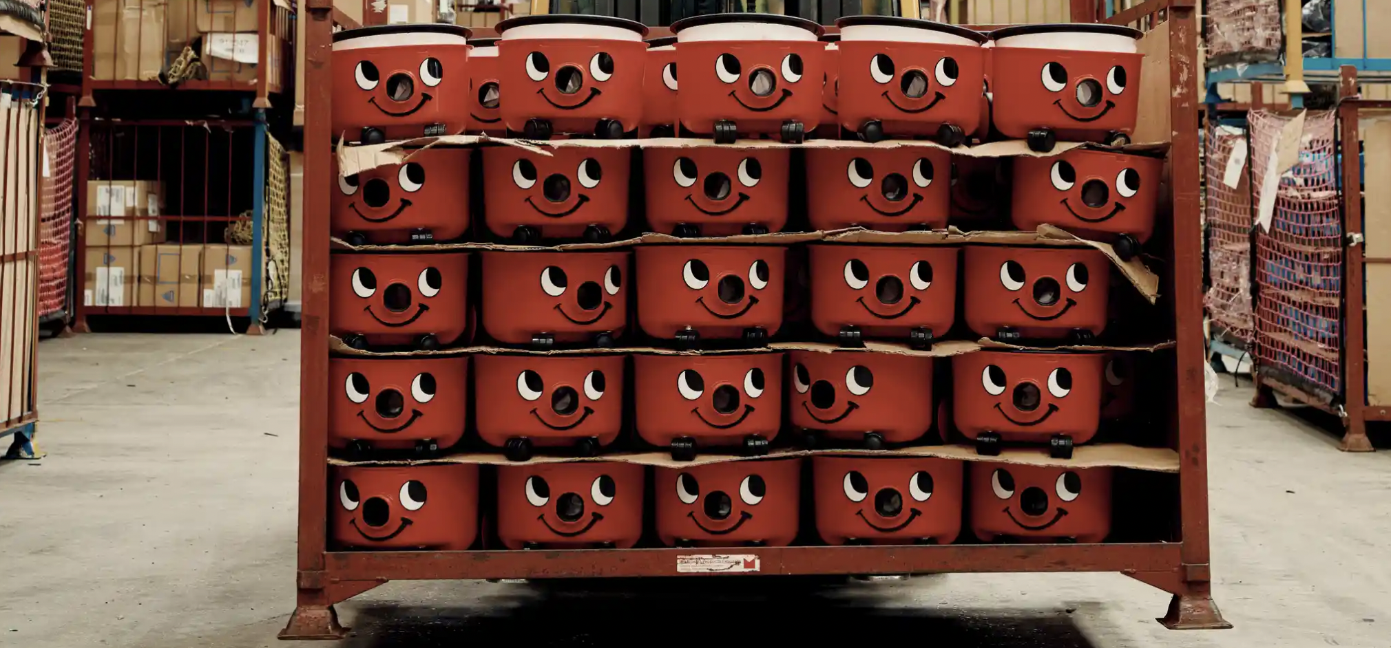 By the mid-70s, after Numatic had found some success, Duncan was on a British stand at a Lisbon trade show. “It was as boring as sin,” he recalls. One evening, Duncan and one of his salesmen idly began to dress up their latest vacuum cleaner, first with a bit of ribbon, then with a union flag badge on what started to look a bit like a hat. They found some chalk and drew a crude smile under the hose outlet, which suddenly looked like a nose, then some eyes. Searching for a nickname that felt suitably British, they settled on Henry. “We put it over in the corner with all the other equipment and the next day people were laughing and pointing,” Duncan says. Back at Numatic, which then had a few dozen employees, Duncan asked his advertising guy to design a proper face for the cleaner. “Henry” remained an in-house nickname; the product still had Numatic printed above its eyes.